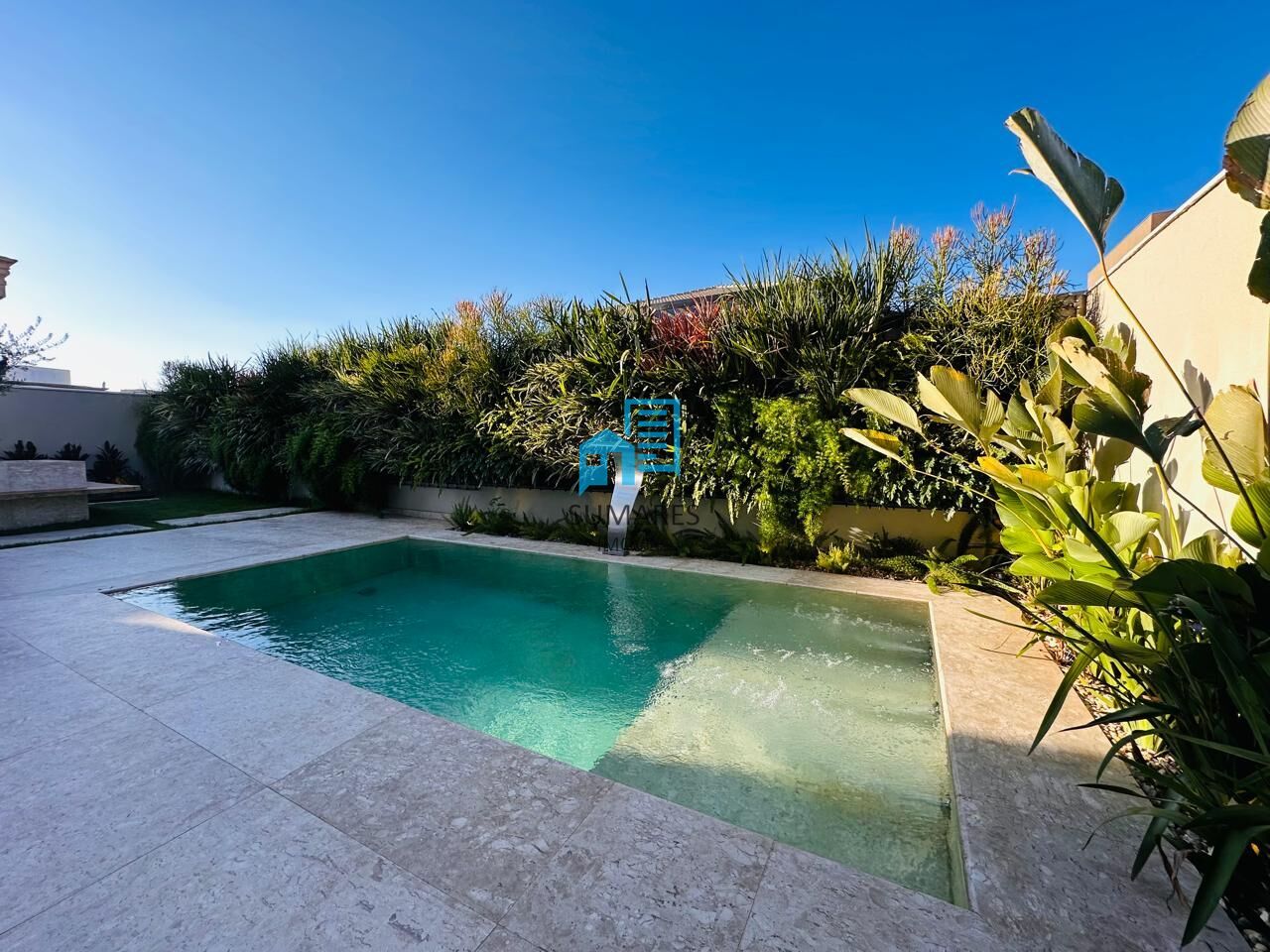 Quintal piscina aquecida em pedra “Travertino” (trocador de calor) e paisagismo