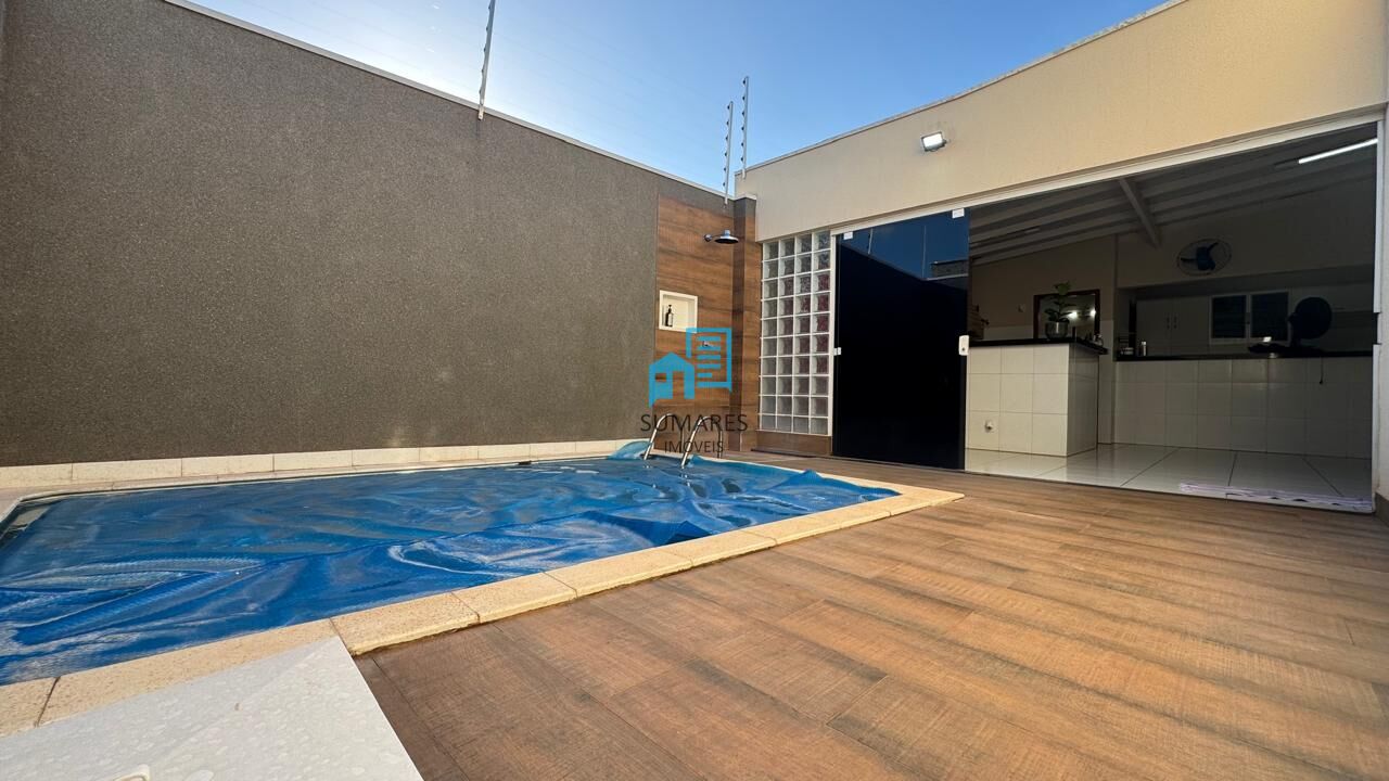 Casa com 2 dormitórios sendo 1 suíte, sala ampla, banheiro social, banheiro externo, lavanderia, despensa, cozinha com armários, área gourmet, ar condicionado, armários, alarme, piscina, aquecedor solar, garagem coberta para dois carros.